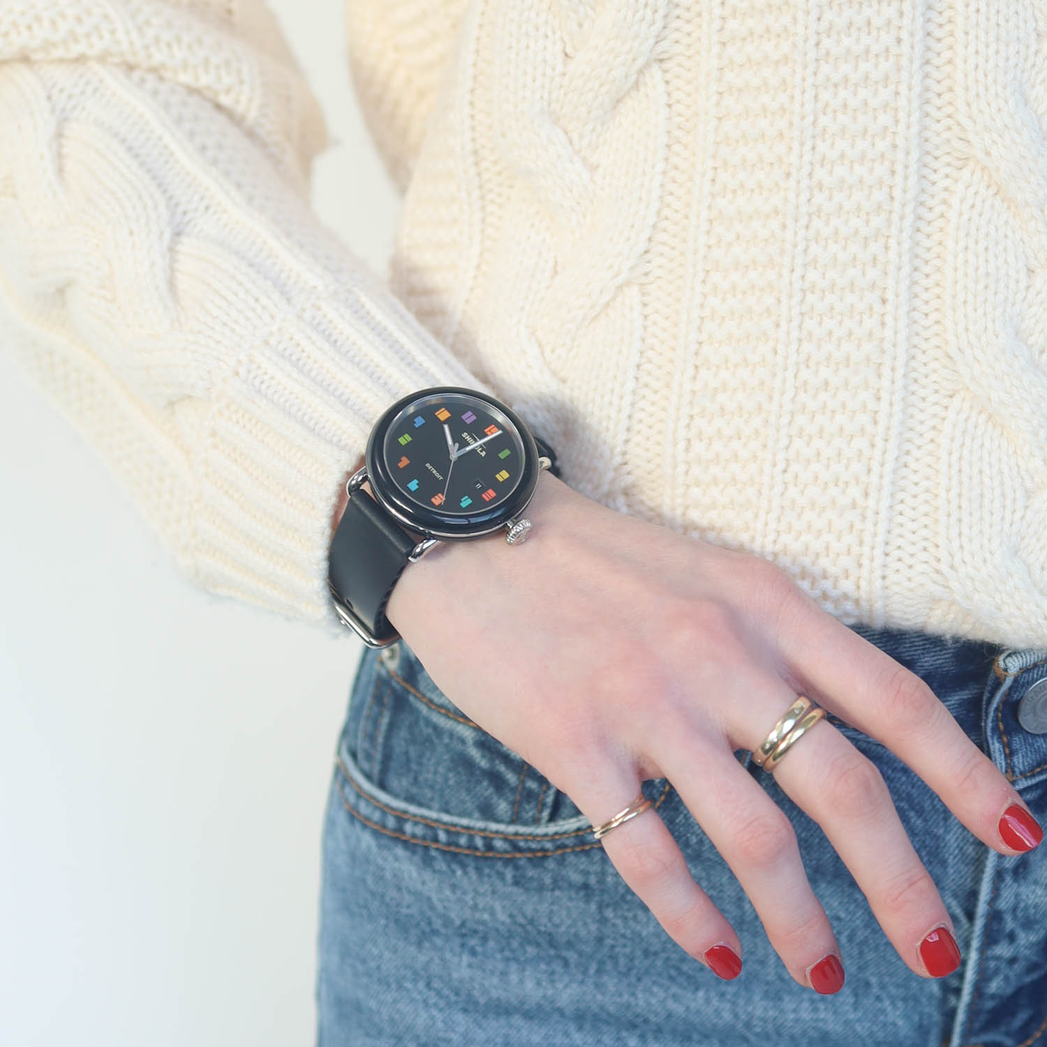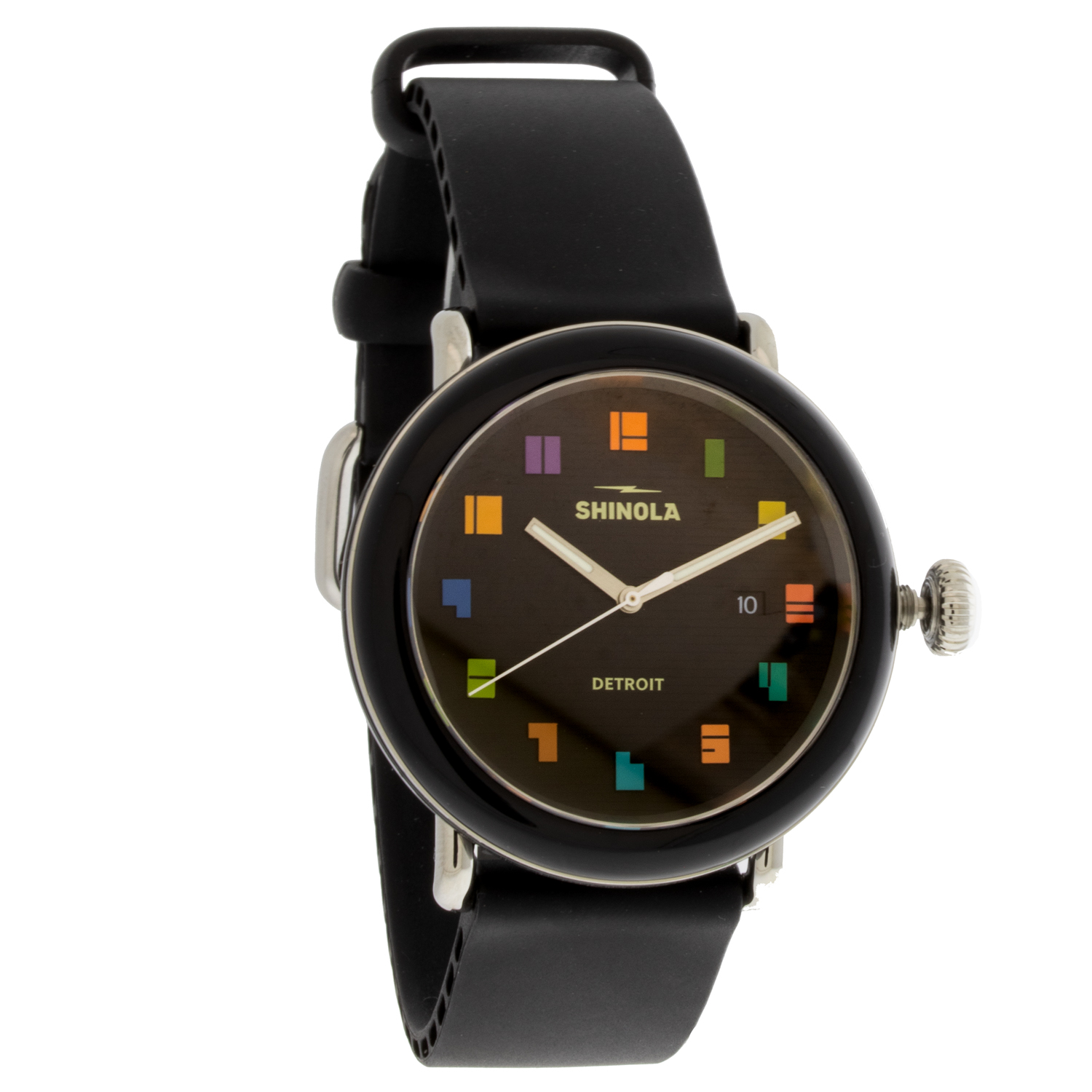 This watch by Shinola is serving everything modern and sleek, popping with fun, colorful details. From the dark dial to the multicolor block numerals, this watch is modern and abstract with a retro touch. The sapphire crystal serves as a protective shield, preserving the watch from scratches and other mishaps over the years.