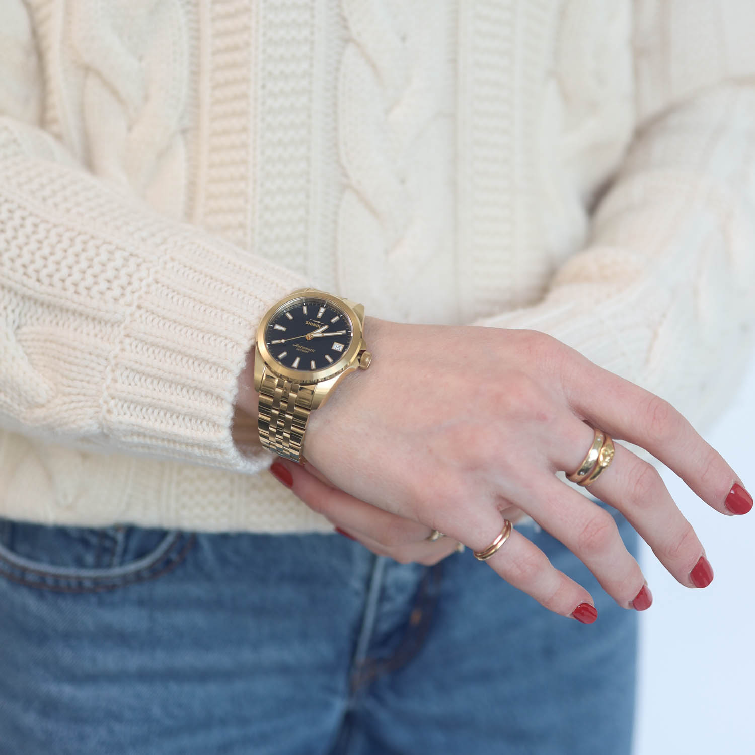 This heirloom-ready watch by Shinola is serving everything modern and sleek, garnished by refined, timeless details. The two-tone polished stainless steel case that wraps elegantly around the clean and open black dial is a seamless design executed with fresh inspiration from American design heritage. The double-domed sapphire crystal serves as a protective shield, preserving the watch from scratches and other mishaps over the years.