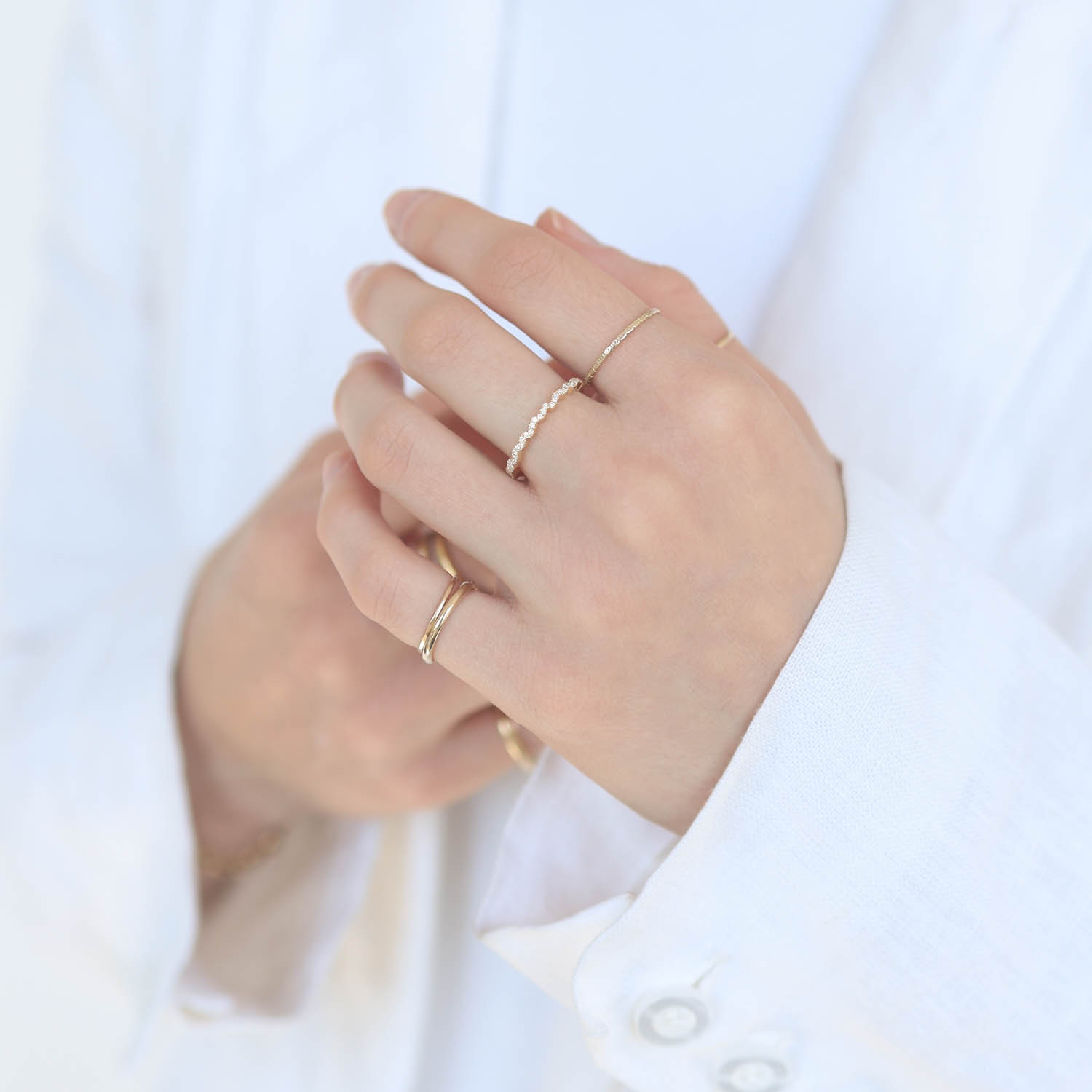 A shimmering display of diamonds adorn a shiny gold band in a wave-like pattern. Worn alone, nestled into a stack, or paired with an engagement ring, this ring is sure to be a longtime favorite in your collection.