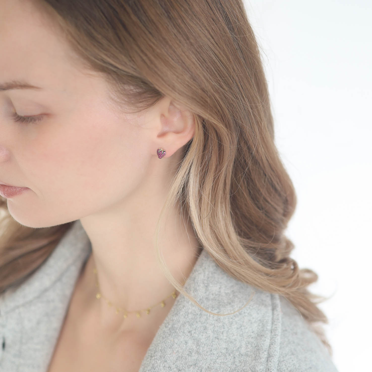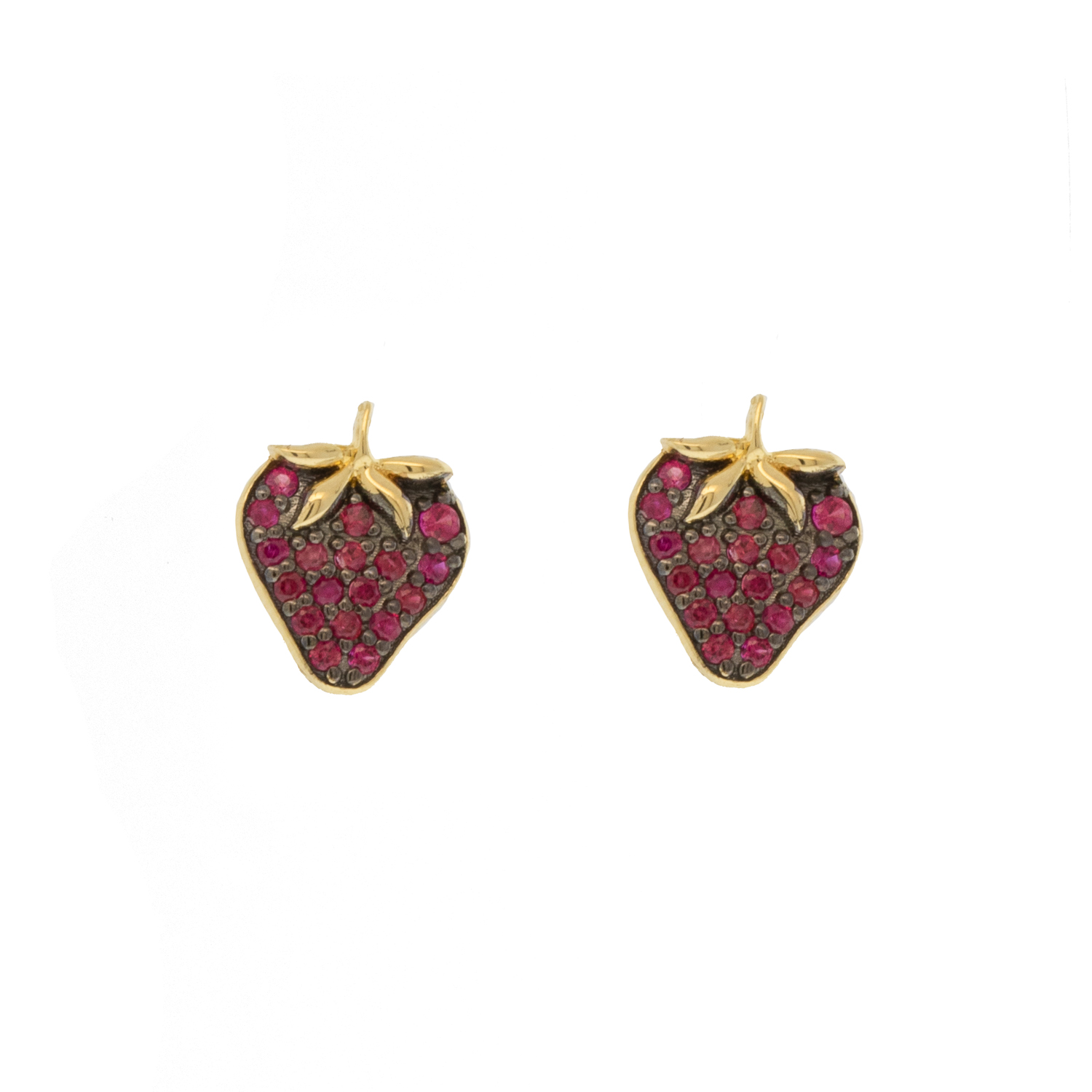 Little strawberry earrings are as adorable as it gets. These sweet studs are colored by blushing rubies, complete with golden tops.
