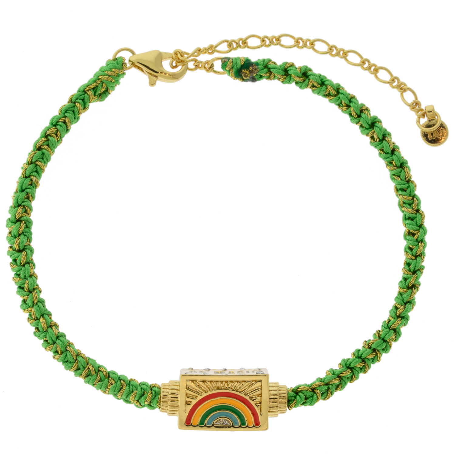 This bracelet is a four-in-one package, rendering four different sides of a single charm to switch as you please. A mushroom, a rainbow, and a little bit of magic; these designs are able to be rotated along their green macrame cord.