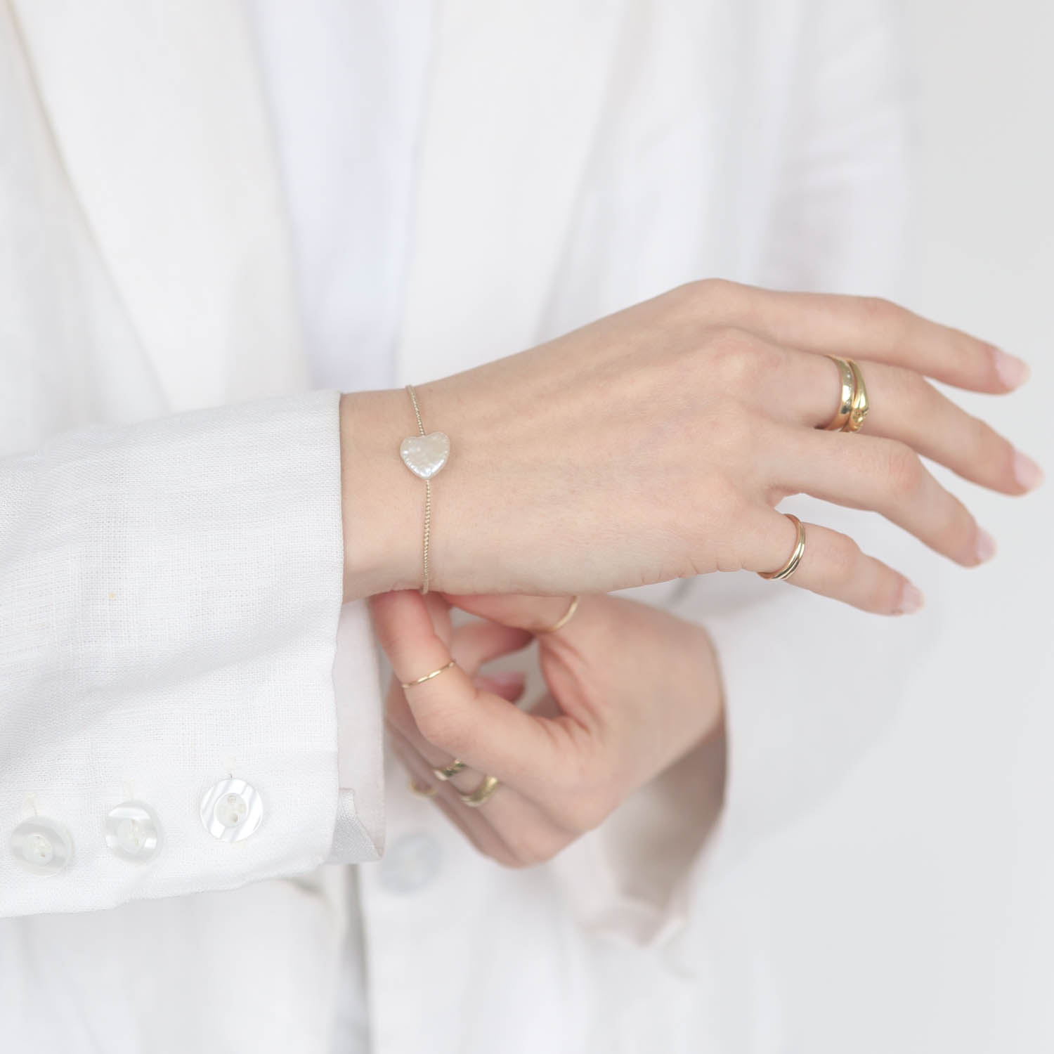 A cream-colored, thin cord displays a unique heart-shaped pearl charm, creating the perfect everyday bracelet.