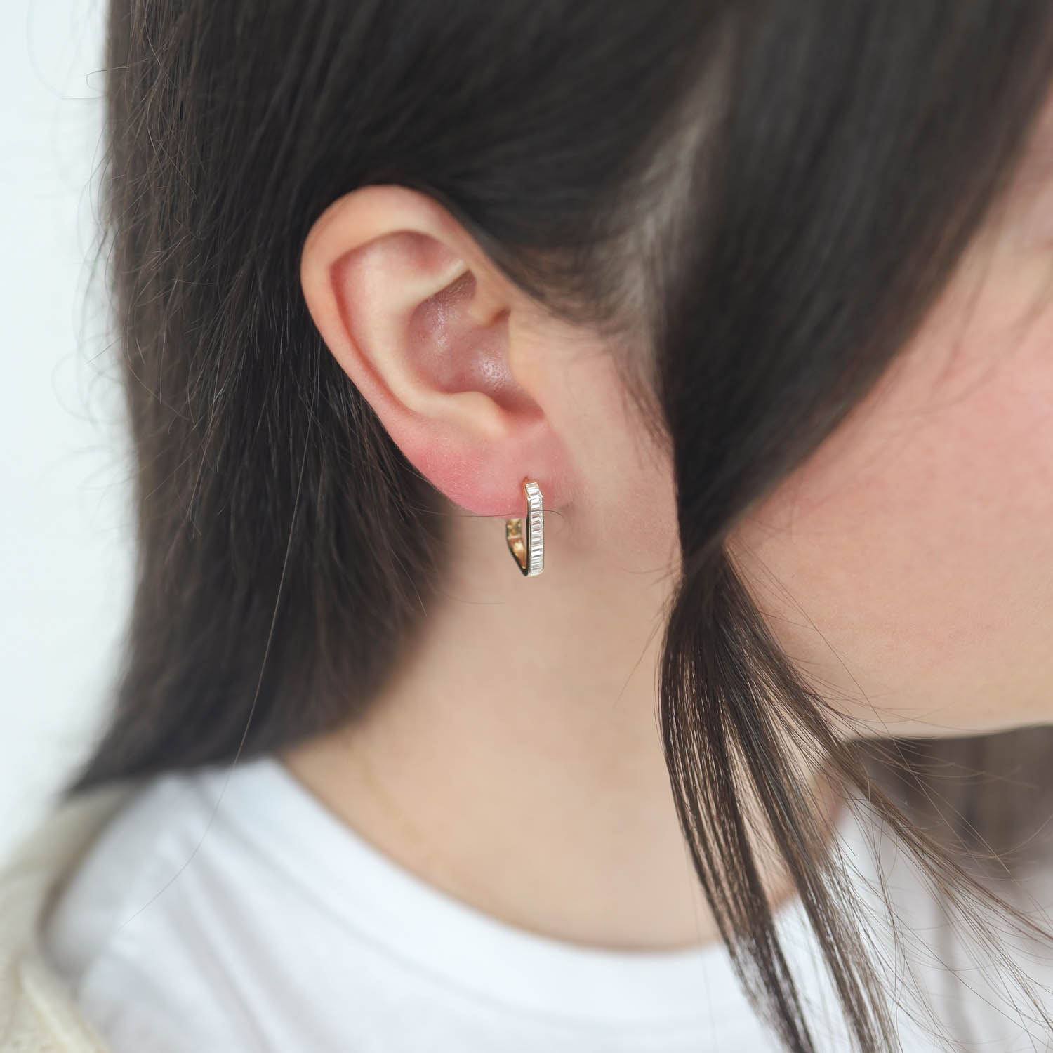 These little huggies, adorned with cubic zirconium baguettes, have all the glamour you’ll ever need. As an addition to your other favorite earrings or worn alone, they are sure to stand out.
