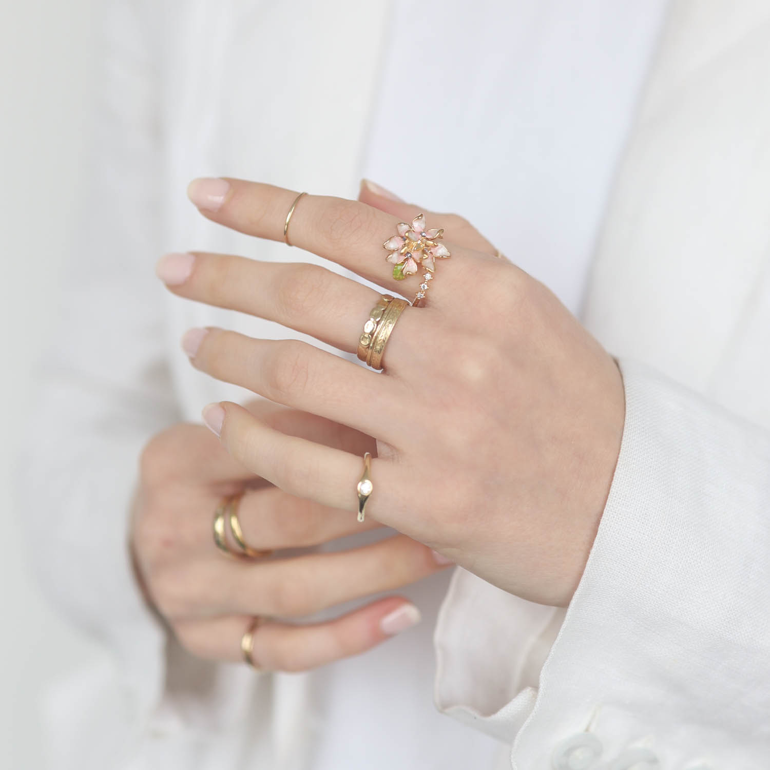 This floral enamel ring is a whimsical addition to your stack, able to be adjusted to size.