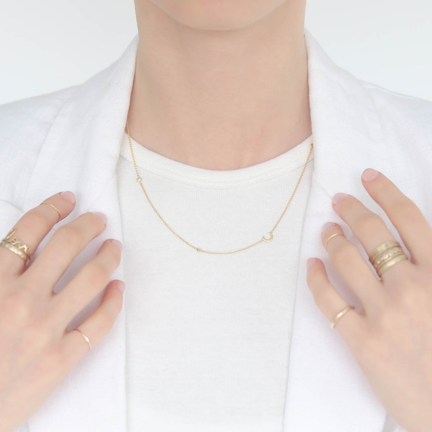 A little letter C sits asymmetrically along a fine gold chain, accompanied by a bezeled cubic zirconium.