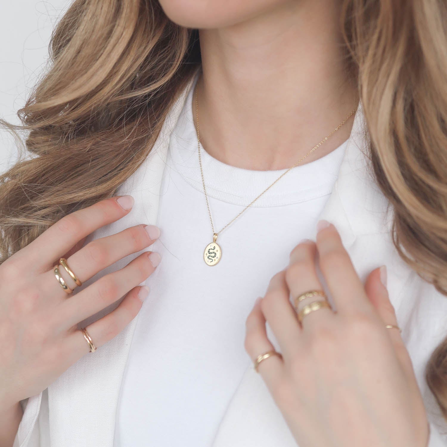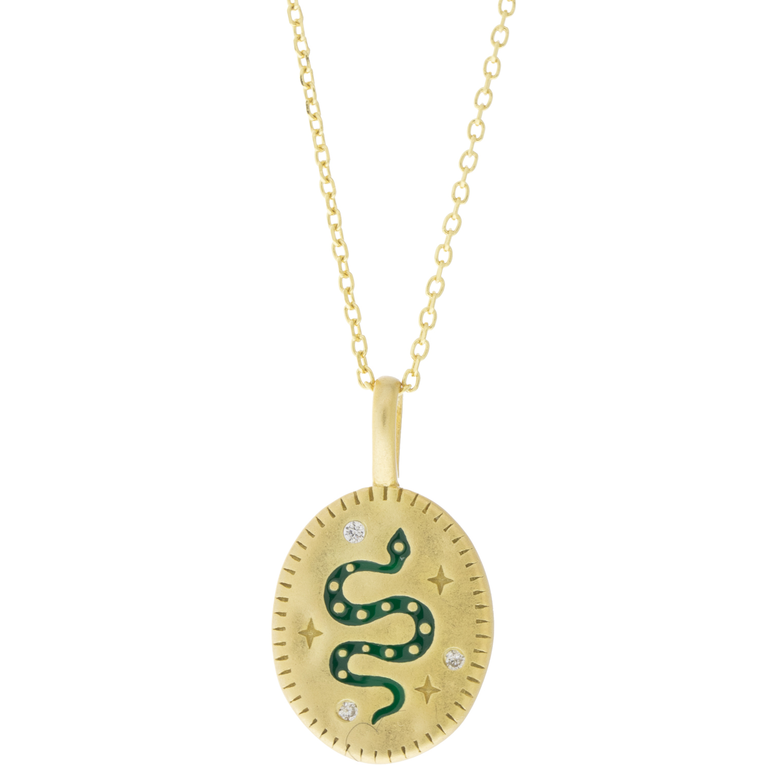 A slithering snake is accented by sparkling CZ stones. This necklace is both edgy and whimsical.