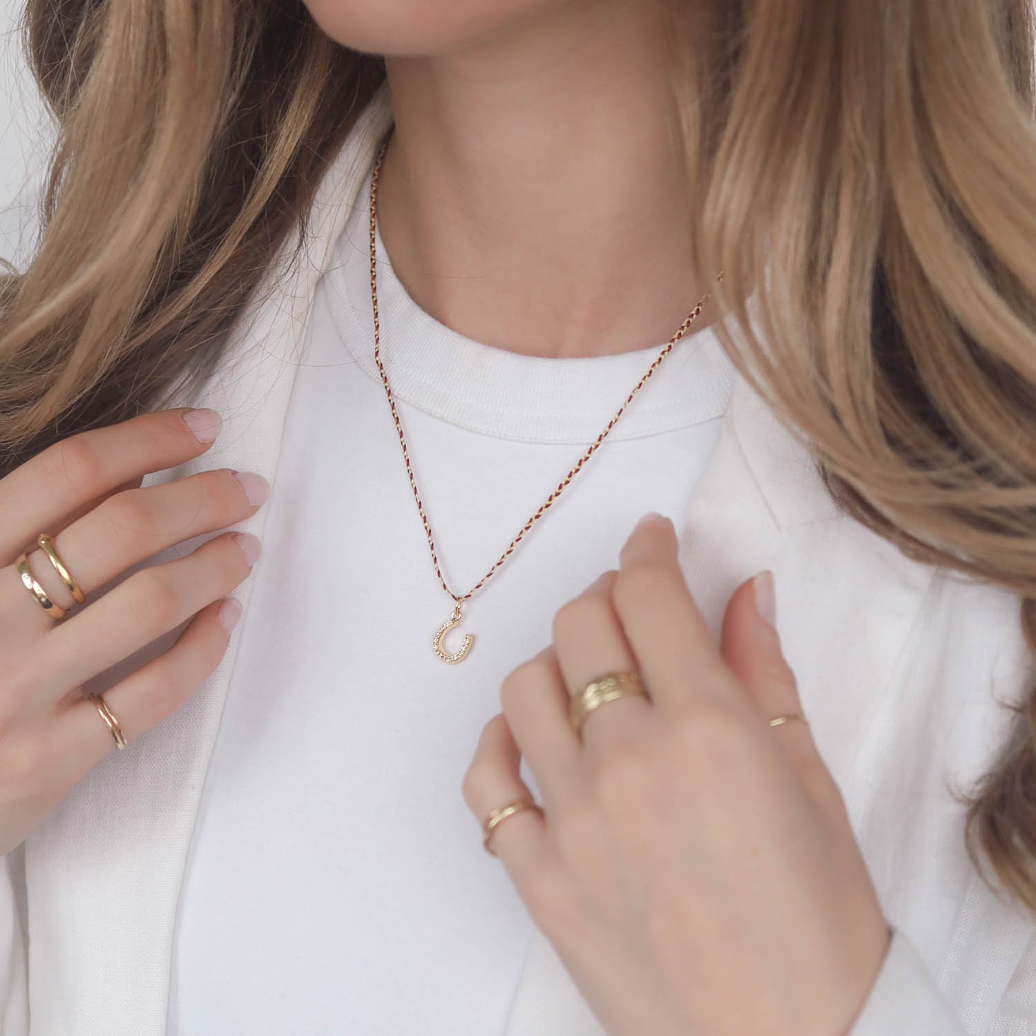 A horseshoe falls gently on this red and cream cord, creating a piece that is perfect for layering or wearing solo.