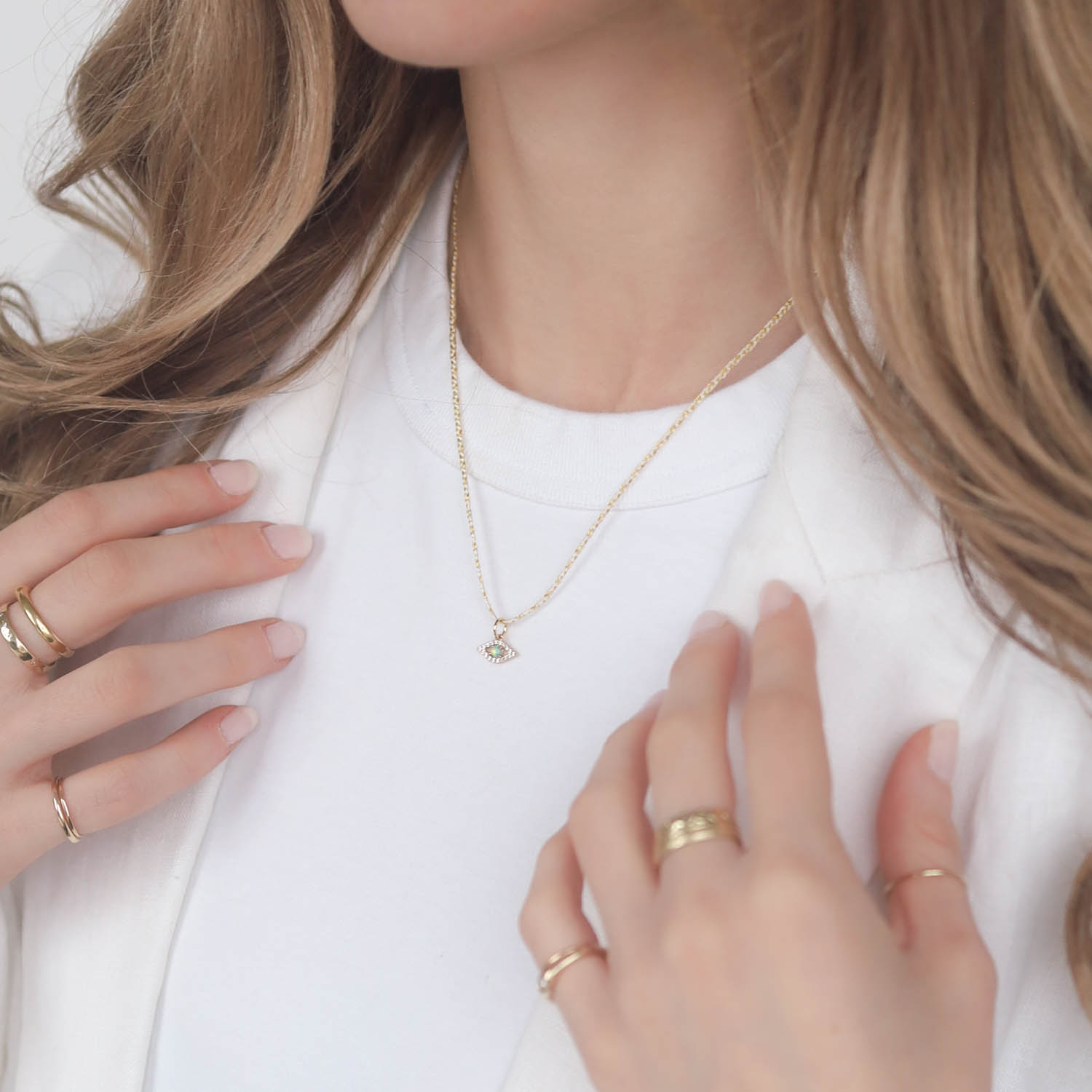 An evil eye falls gently on this cream and gold cord, creating a piece that is perfect for layering or wearing solo. Evil eyes have long been worn as a talisman to ward off evil.