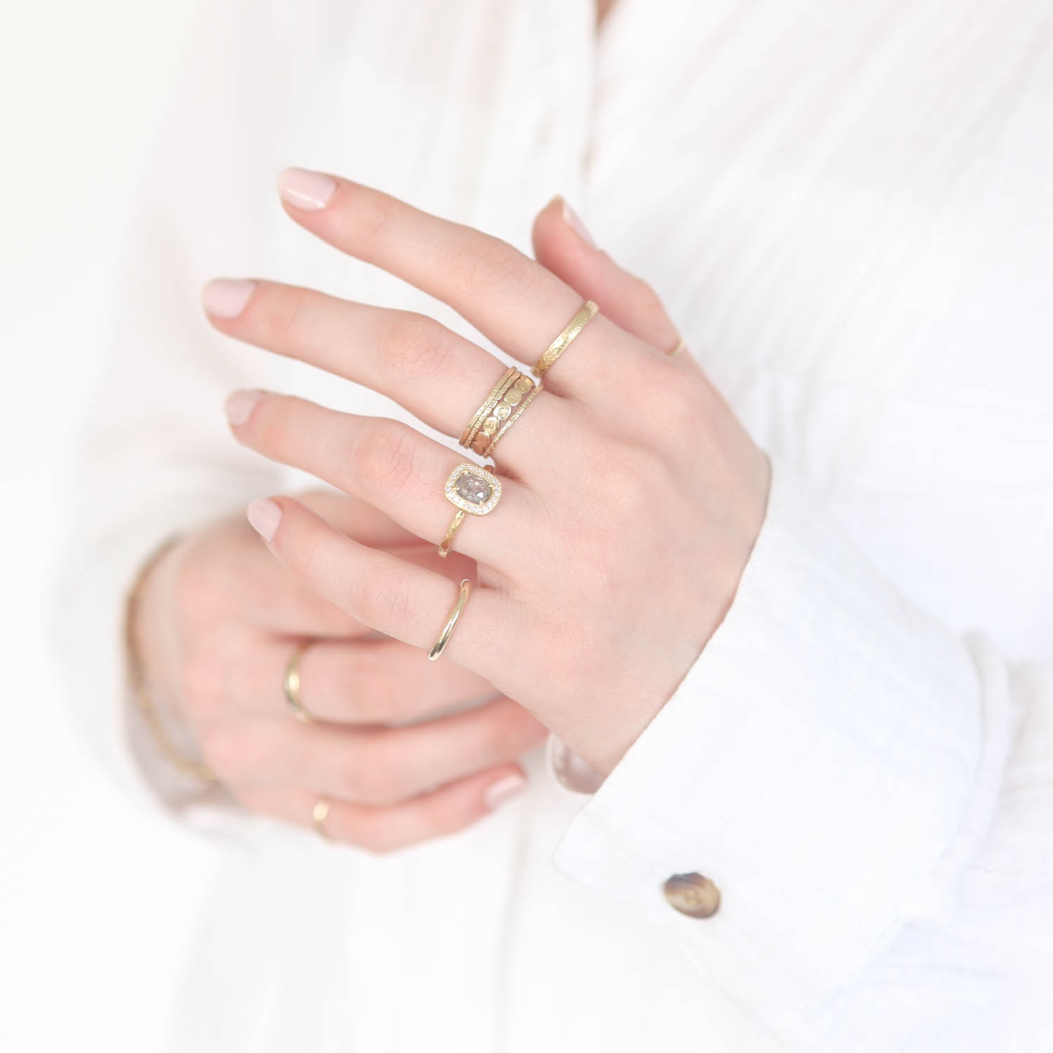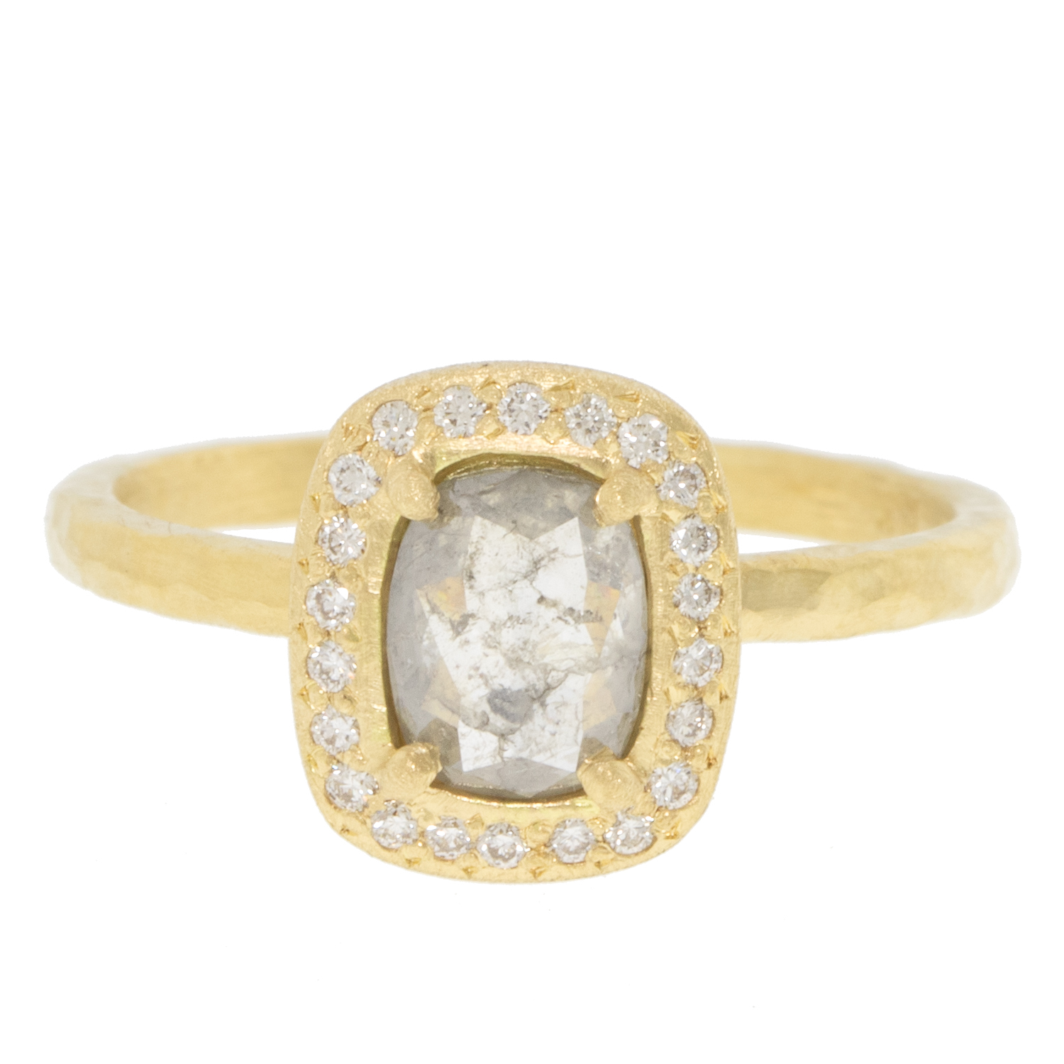 Framed by sparkling diamonds and set by gold prongs on a simplistic band, this grey diamond is sleek and sophisticated; a stunning keepsake jewel.