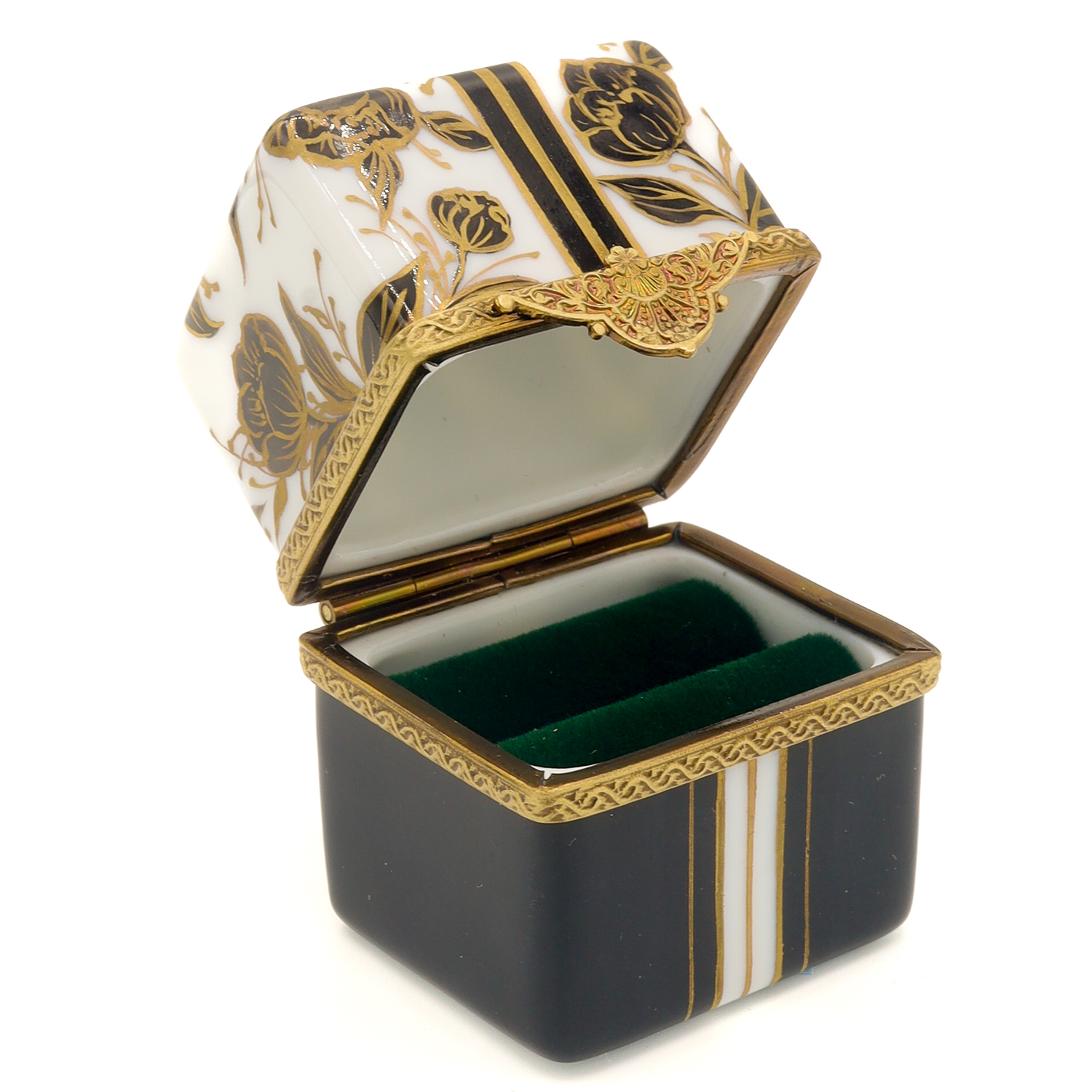 Hand-painted black peonies, outlined in bright gold, sprawl the surface of this decadent ring box, crafted from the finest materials. Past the ornate gold closure, inside of the box is a lush, green ring pillow to hold your most cherished keepsakes.