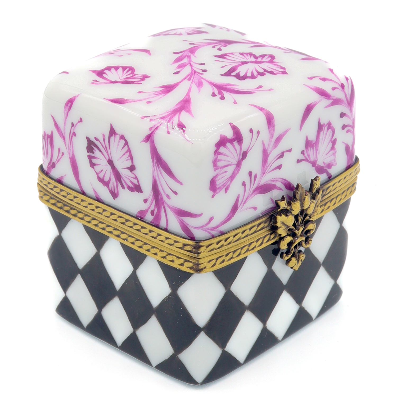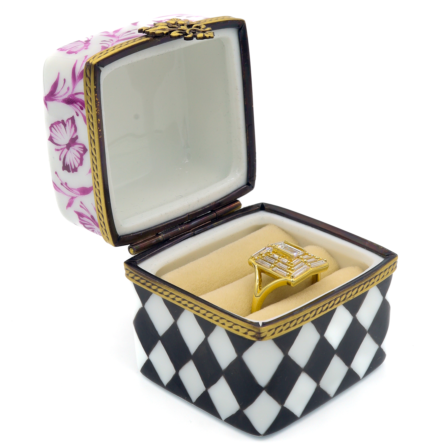 A bold black argyle pattern and delicate purple butterflies adorn the surface of this decadent ring box, crafted from the finest materials. Past the ornate gold closure, inside of the box is a lush, cream ring pillow to hold your most cherished keepsakes.