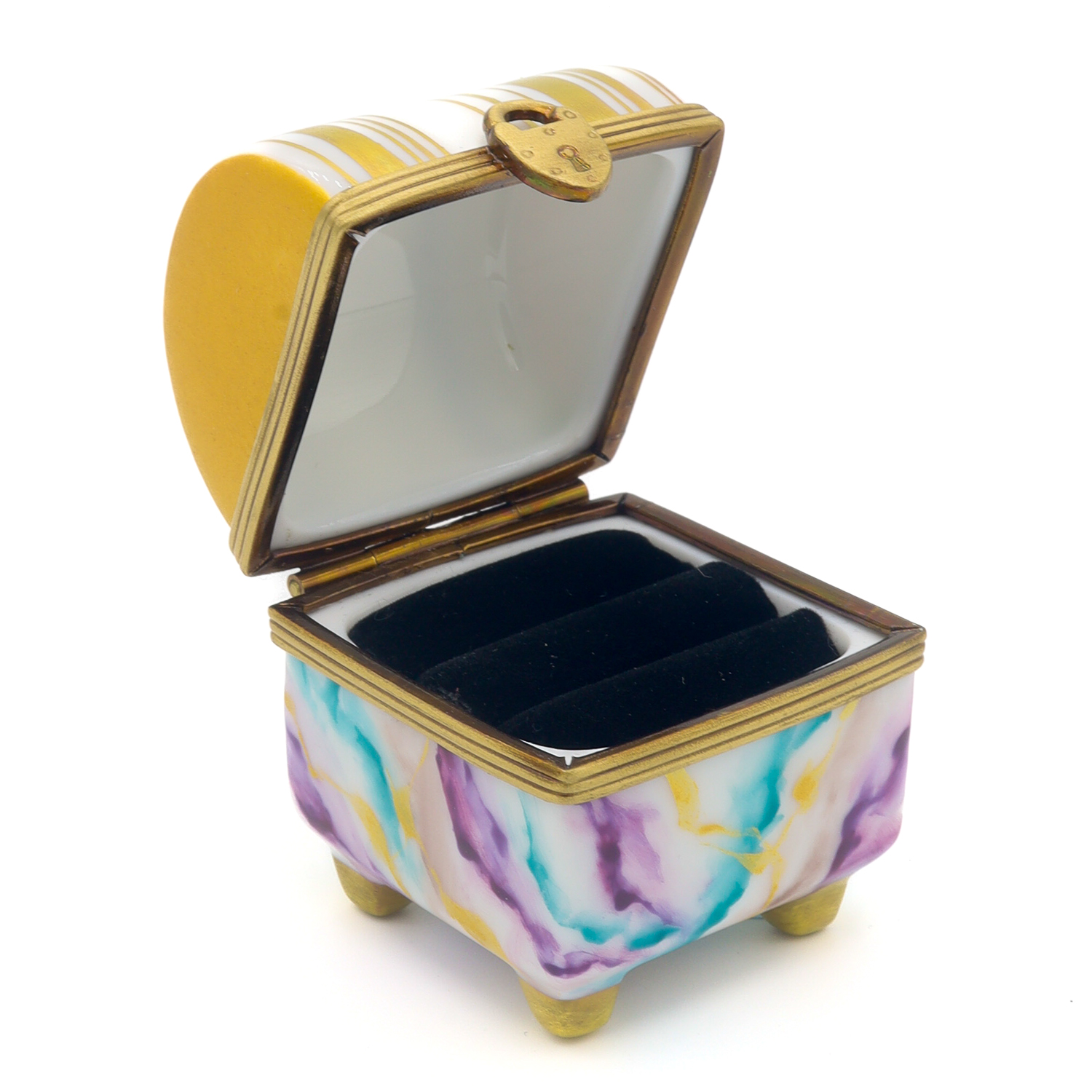Bright gold, hand-painted lines and colorful marble adorn the surface of this decadent ring box, crafted from the finest materials. Past the padlock-shaped gold closure, inside of the box is a lush, black ring pillow to hold your most cherished keepsakes.